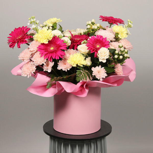 • Состав: Гербера, гвоздика, роза кустовая, хризантема