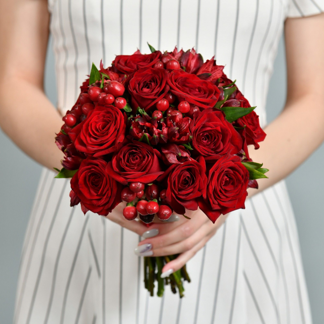 Состав: роза одноголовая 11 шт, гиперикум 5 шт, альстромерия 5 шт