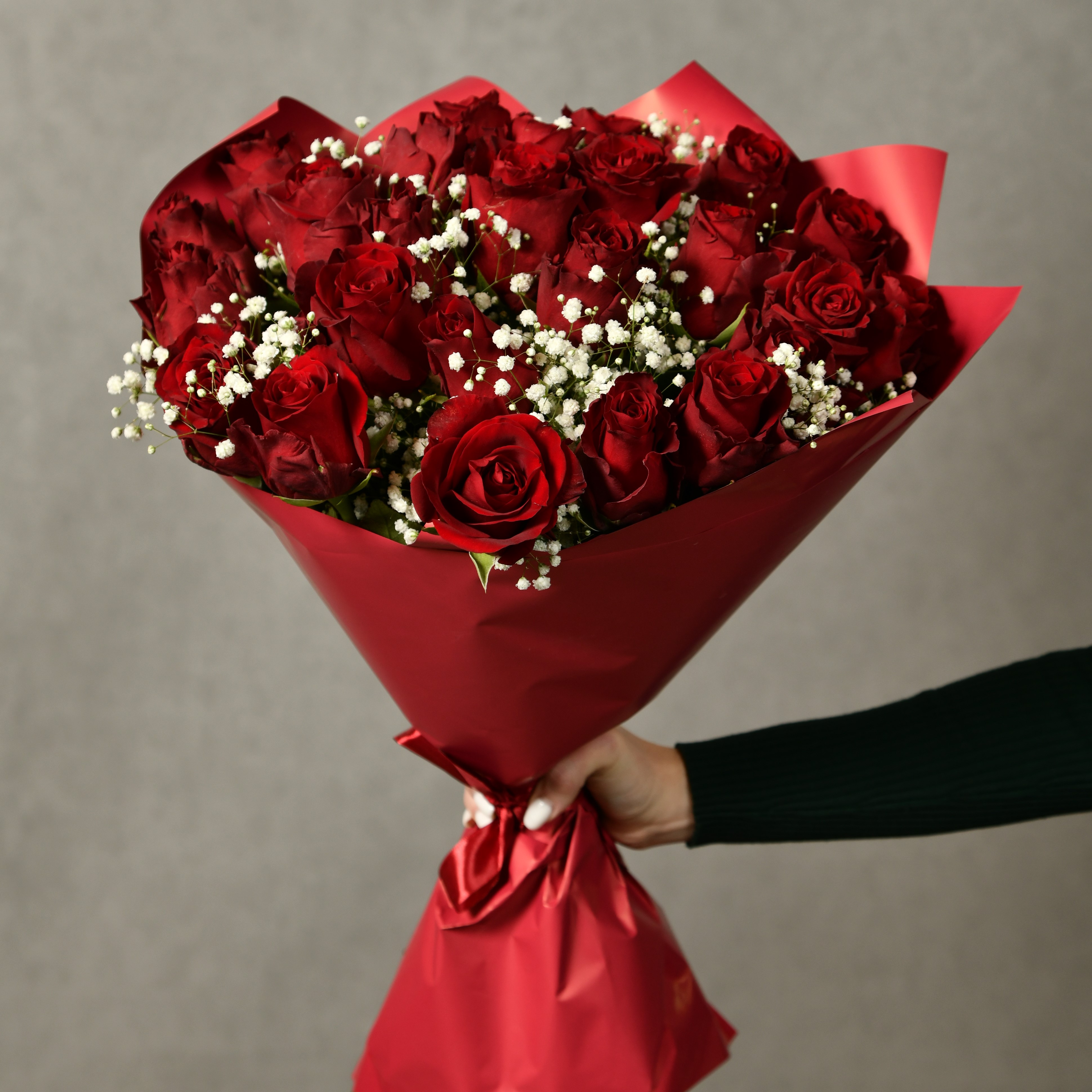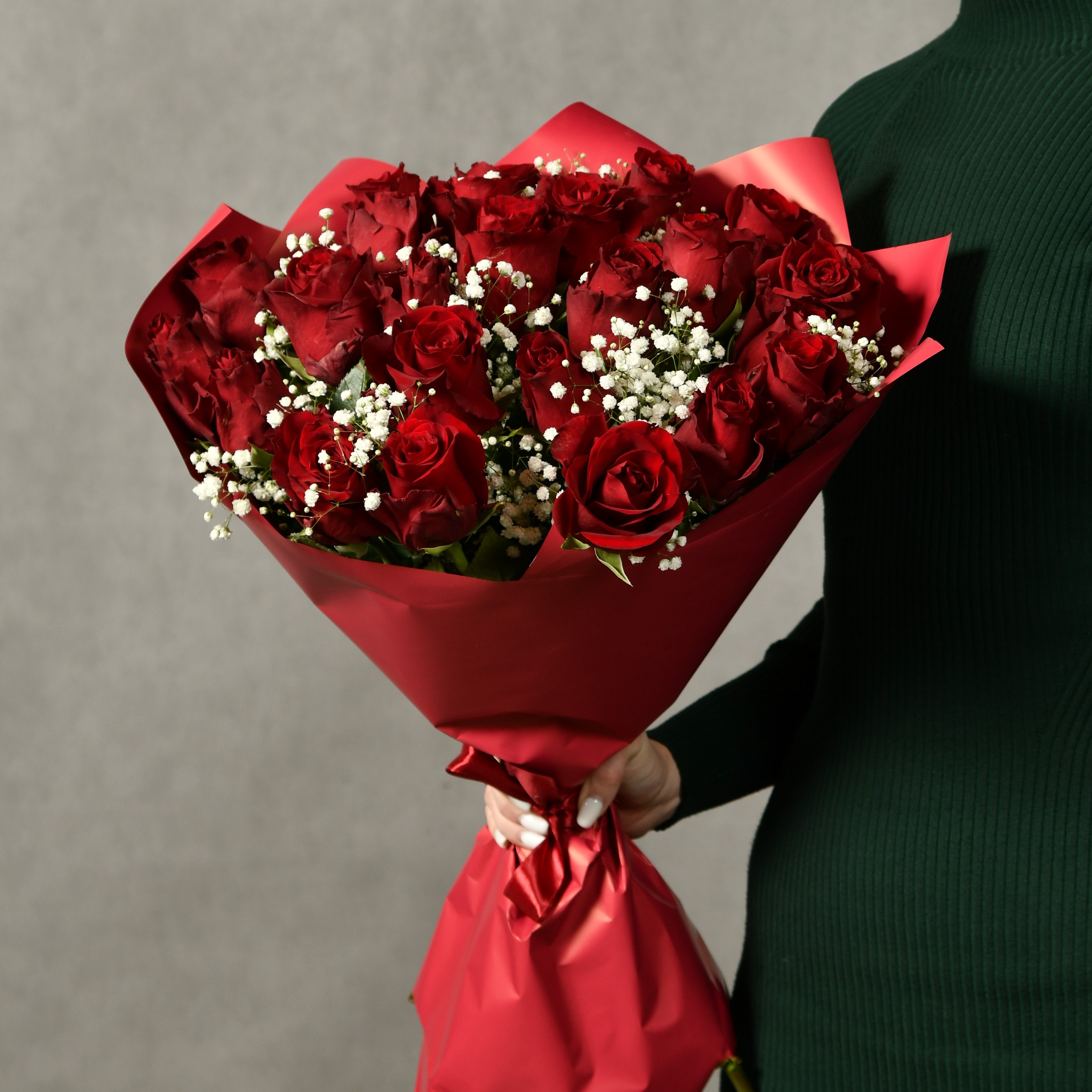 • Состав: Роза одноголовая 25 шт, гипсофила