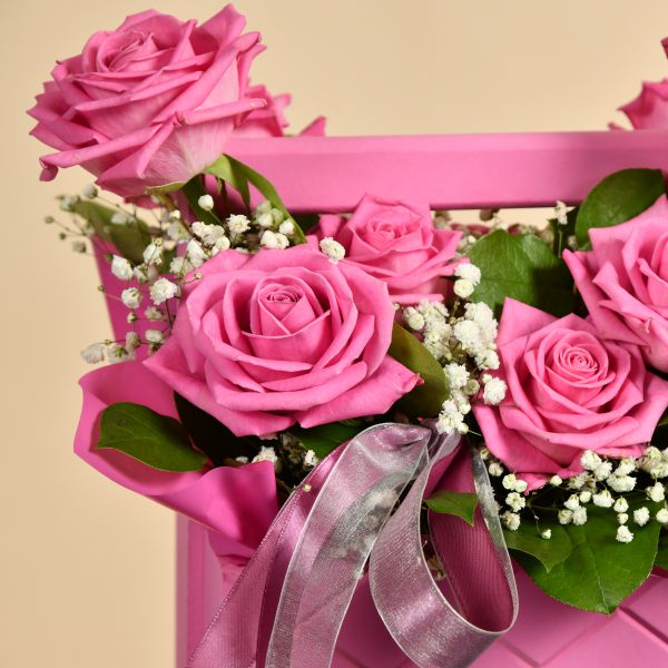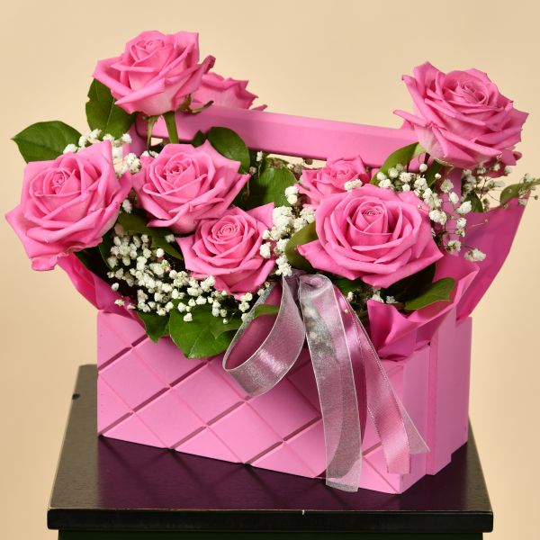 Элегантный букет из свежих розовых роз представленны в стильном деревянном ящике.
