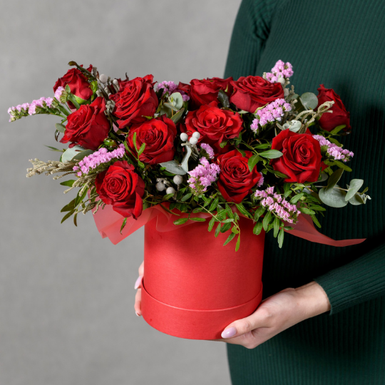 Яркая композиция из роз и зелени порадует получателя своей красотой. Цветочная композиция в шляпной коробке - универсальный подарок, который всегда смотриться дорого и элегантно.