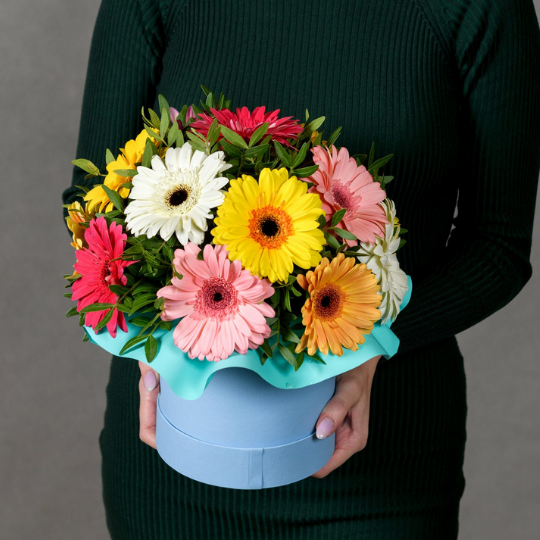 Яркая композиция из цветных гербер будет долгое время вдохновлять и радовать своей красотой! Дарите незабываемые эмоции и прекрасное настроение!