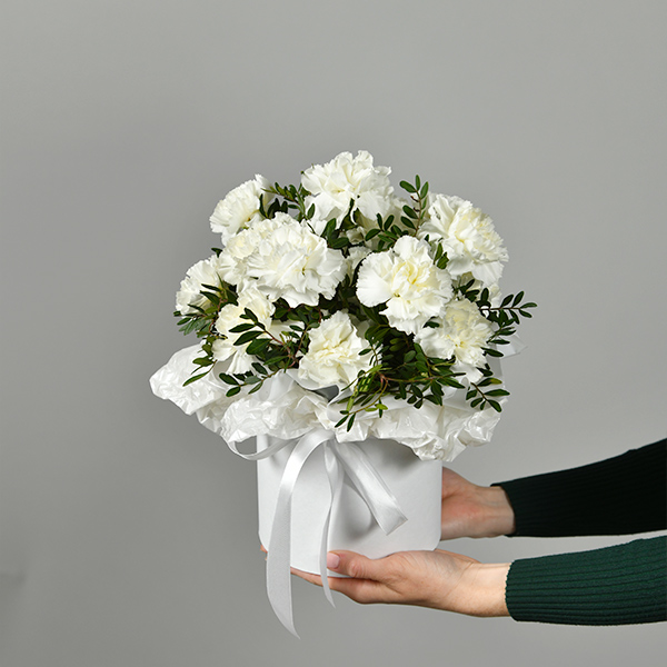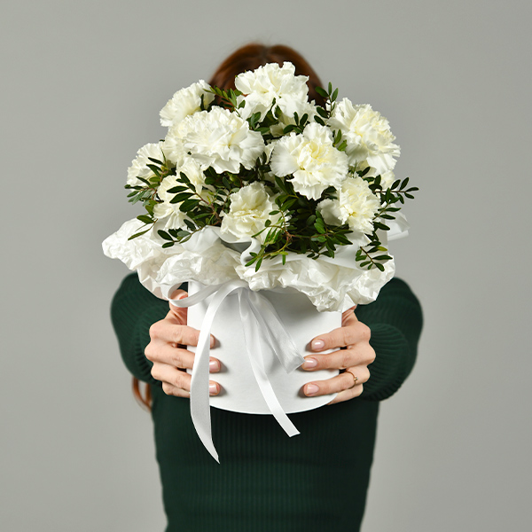 Белоснежная композиция из гвоздик будет долгое время вдохновлять и радовать своей красотой! Дарите незабываемые эмоции и прекрасное настроение!