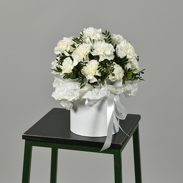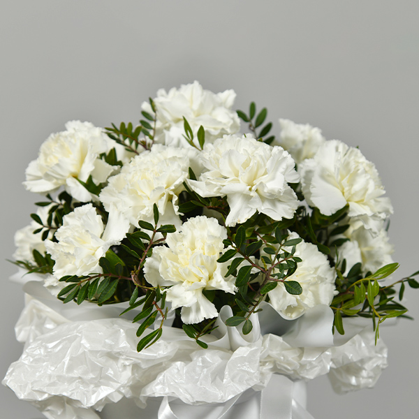 Белоснежная композиция из гвоздик будет долгое время вдохновлять и радовать своей красотой! Дарите незабываемые эмоции и прекрасное настроение!