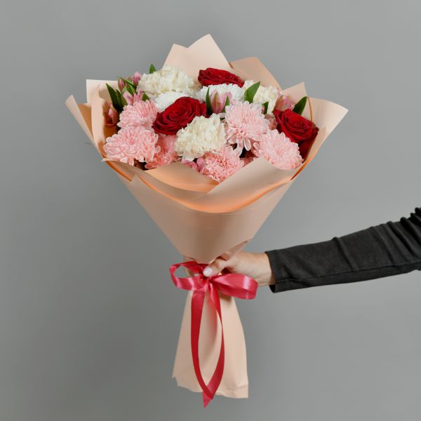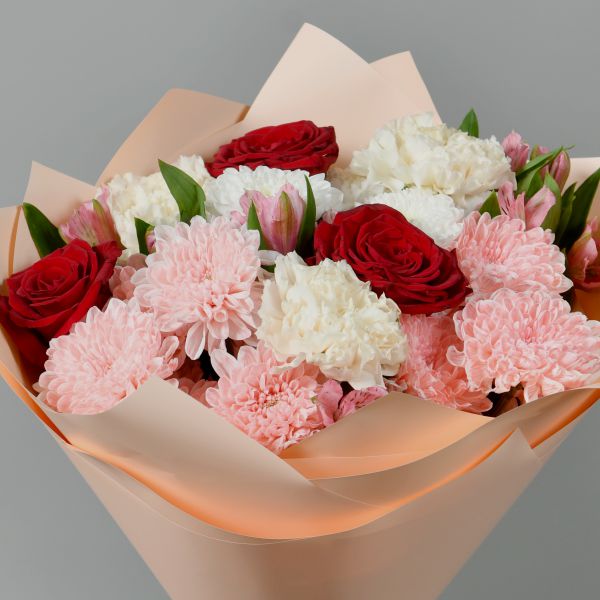 • Состав: Роза, гвоздика, хризантема кустовая, альстромерия