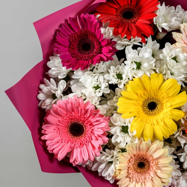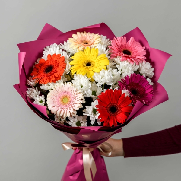 Яркий букет из хризантемы и герберы. Приятный презент для любой девушки.