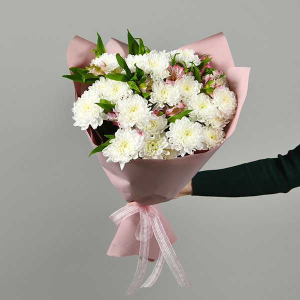 Букет из белых хризантем и розовой альстромерии — это элегантная и свежая композиция, которая сочетает в себе чистоту и нежность.