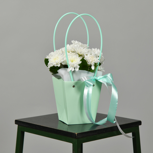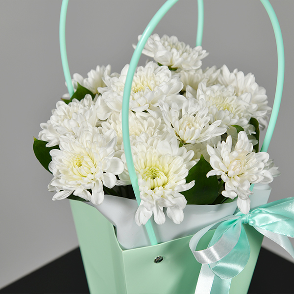 Кустовая хризантема - это стойкий цветок, который красиво смотриться в оригинальных сумочках. Композиция из хризантем всегда в тренде. Хризантемы можно подарить по любому поводу и просто как знак внимания.