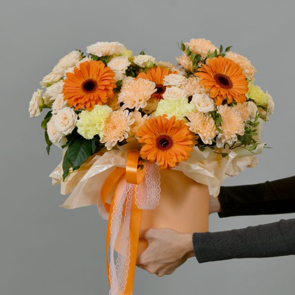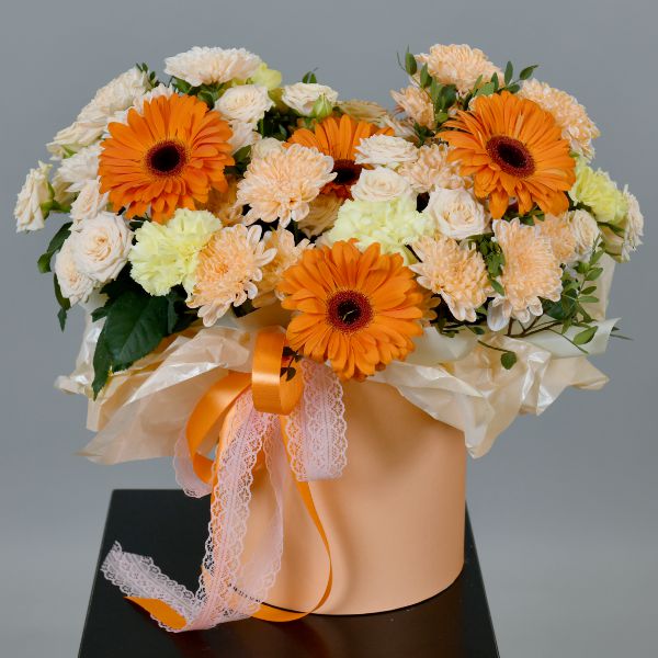 Яркая композиция из герберы, гвоздики и хризантемы порадует получателя своей красотой.Цветочная композиция в шляпной коробке - универсальный подарок, который всегда смотриться дорого и неотразимо.