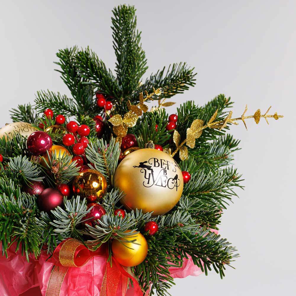 Каждая новогодняя композиция из лапника — это уютный кусочек зимнего леса, украшенный шишками, декором и тонким инеем, будто снег только что осел на ветвях. Лапник пихты создает глубокую, натуральную текстуру, а акценты в золоте, серебре или красном добавляют праздничное сияние — идеально для дома, офиса или подарка, который говорит без слов.