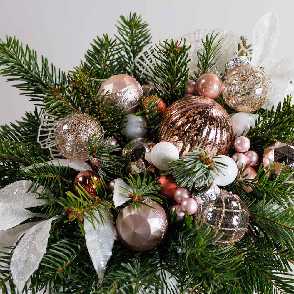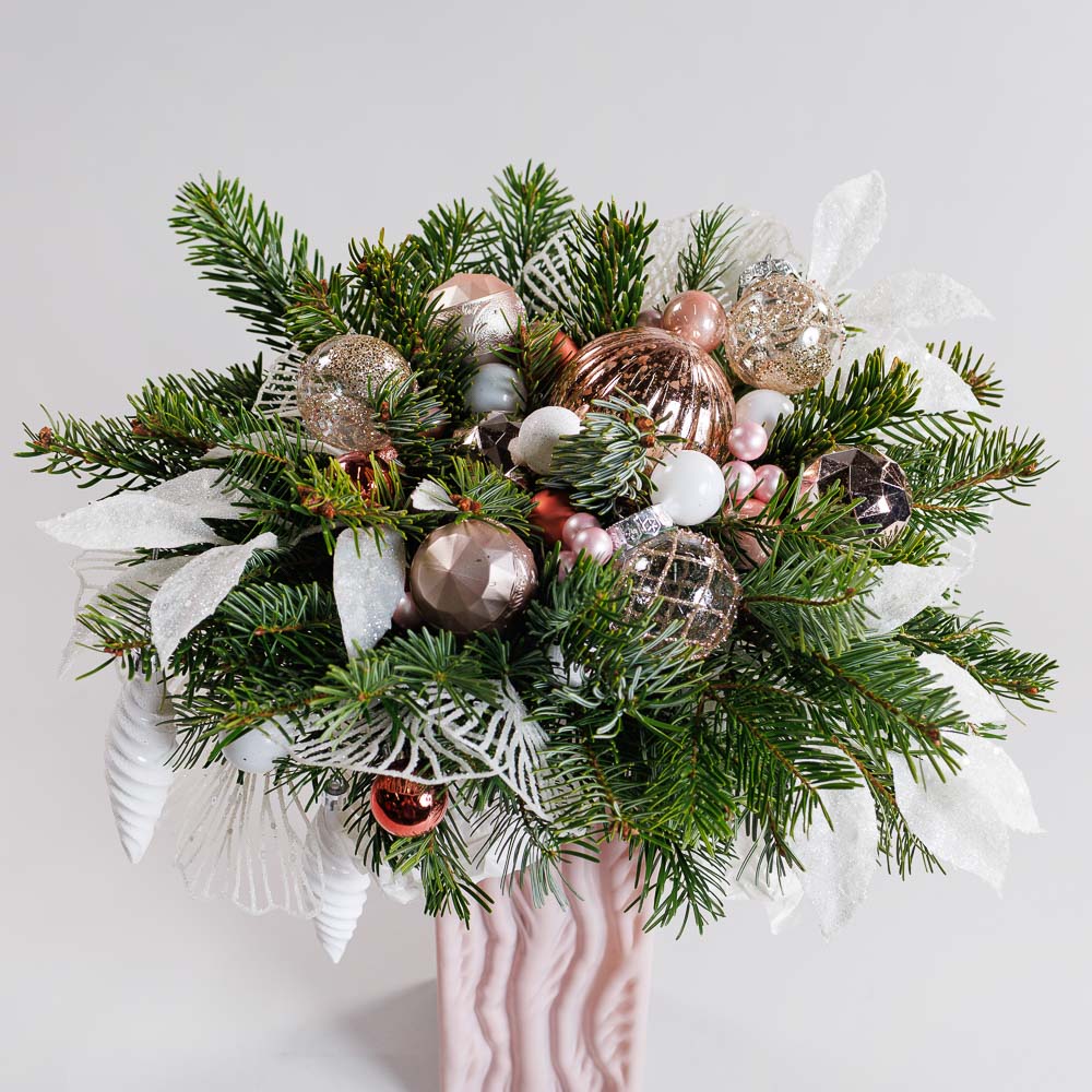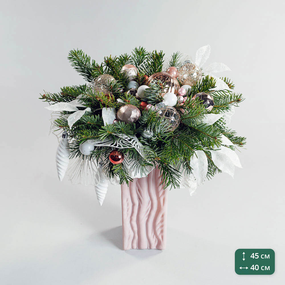 Каждая новогодняя композиция из лапника — это уютный кусочек зимнего леса, украшенный шишками, декором и тонким инеем, будто снег только что осел на ветвях. Лапник пихты создает глубокую, натуральную текстуру, а акценты в золоте, серебре или красном добавляют праздничное сияние — идеально для дома, офиса или подарка, который говорит без слов.