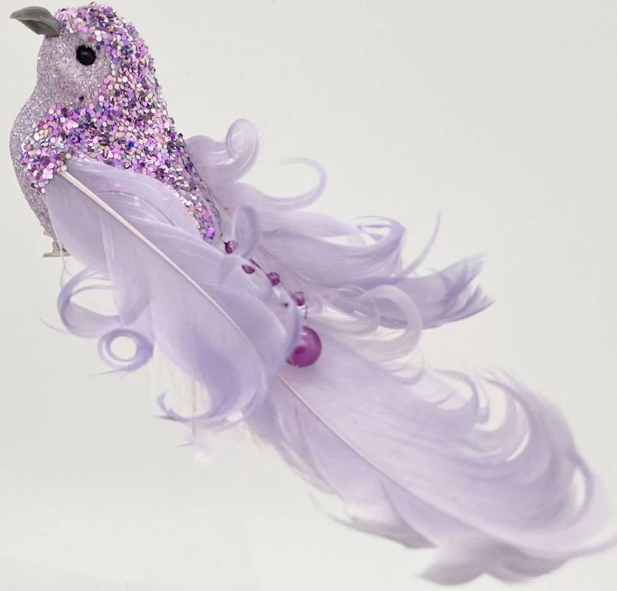 Птичка на клипе 15*3,5*5,5см глиттер 12шт/уп светло-сиреневый