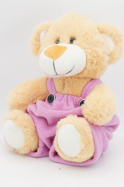 Мягкая игрушка Медвежонок Сильвестр золотой в комбинезоне цвета цикламен 20/25см