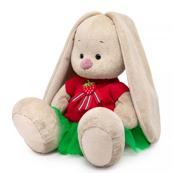 Мягкая игрушка Зайка Ми в комбинированном платье с земляничкой (большой) h23см