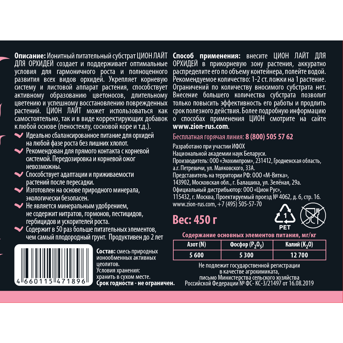 ЦИОН ДЛЯ ОРХИДЕЙ создает и поддерживает оптимальные условия для гармоничного роста и полноценного развития орхидей. Укрепляет корневую систему и листовой аппарат растения, способствует активному образованию цветоносов, длительному цветению и успешному восстановлению поврежденных растений. ЦИОН может использоваться в виде питательной добавки к любой основе (пеностеклу, сосновой коре и т.д.). Ионитный субстрат ЦИОН ДЛЯ ОРХИДЕЙ рекомендован для обеспечения растения сбалансированным набором элементов питания на любом этапе его жизненного цикла. В течение периода полезного действия субстрата никаких дополнительных подкормок растению не потребуется.