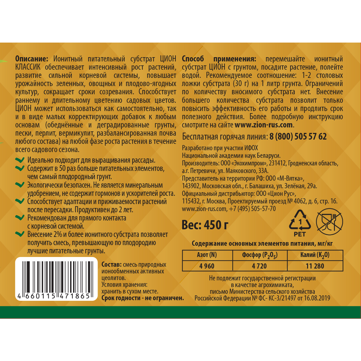ЦИОН КЛАССИК обеспечивает интенсивный рост растений, развитие сильной корневой системы, повышает урожайность зеленных, овощных и плодово-ягодных культур, сокращает сроки созревания. Способствует раннему и длительному цветению садовых цветов. ЦИОН может использоваться как самостоятельно, так и в виде малых корректирующих добавок к любым основам (обеднённые и деградированные грунты, пески, перлит, вермикулит, разбалансированная почва любого состава) на любой фазе роста растения в течение всего садового сезона. В течение периода полезного действия ЦИОНа никаких дополнительных подкормок растению не потребуется.