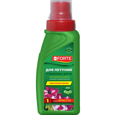 Bona Forte Красота – специализированное жидкое удобрение, предназначенное для подкормки петуний и балконных цветов. Препарат содержит оптимальный баланс микро- и макроэлементов, а также аминокислоты и витамины, что обеспечивает полноценное развитие и продолжительное пышное цветение. А также стимулирует повторное цветение.
