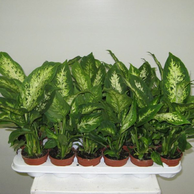 Диффенбахия. Популярное растение в комнатном и офисном озеленении, ценится за крупные пёстрые удлинённо-овальные листья. Сорта диффенбахии: Камилла, Компакта, Марс, Везувий, Мароба.
