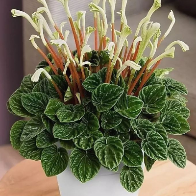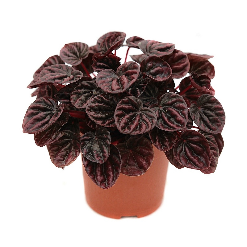 Пеперомия - многолетнее вечнозеленое травянистое растение. Произрастает в тропических районах Южной Америки и Индии, на стволах деревьев или моховой подстилке леса. У Пеперомия Каперата пышные и компактные кусты с  гофрированными сердцеобразными листьями фиолетово-коричневого цвета с утолщенными жилками и глянцевым налетом.