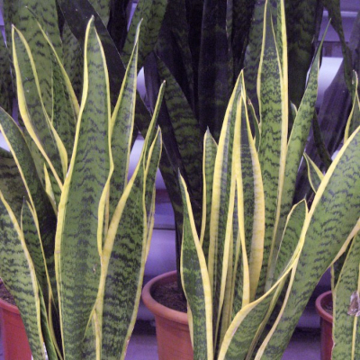 Сансевиерия (сансевьера) трехполосая (Sansevieria trifasciata Prain.). Родина — Южная Африка. Распространенное и весьма стойкое в комнатной культуре растение. Травянистый многолетник с толстым, ползучим корневищем, от которого отрастают мечевидные, прямостоячие, жесткие, с темно-зелеными горизонтальными полосами на светлом фоне листья. Цветки мелкие, беловато-зеленые, собраны в длинную кисть, с приятным запахом. Срезанные листья сансевиерии (сансевьеры) весьма декоративны, долго сохраняются в воде и образуют корни. Зеленовато-белые цветки собраны в метелку длиной 4 см. Цветет весной и осенью.