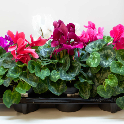 Цветовая палитра цикламенов очень широка: выведены гибриды с белоснежными цветками, вся гамма розовых оттенков до темно-красных, бордовых, фиолетовых. Благодаря характерной форме и отогнутым лепесткам цветки напоминают бабочек. Растение обладает крупным корнем, имеющим форму клубня.