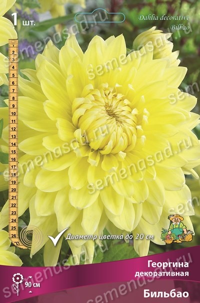 Георгина декоративная Бильбао – изысканный многолетник, который станет настоящим украшением любого сада. Высота растения 90-100 см. Побеги мощные, прямостоячие. Листья крупные, насыщенно-зеленые, с зубчатыми краями. Главное преимущество данного сорта — впечатляющие пышные бутоны размером около 20 см, насыщенной желтой окраски. Солнечная георгина эффектно смотрится в групповых садовых композициях, а также в букетах.