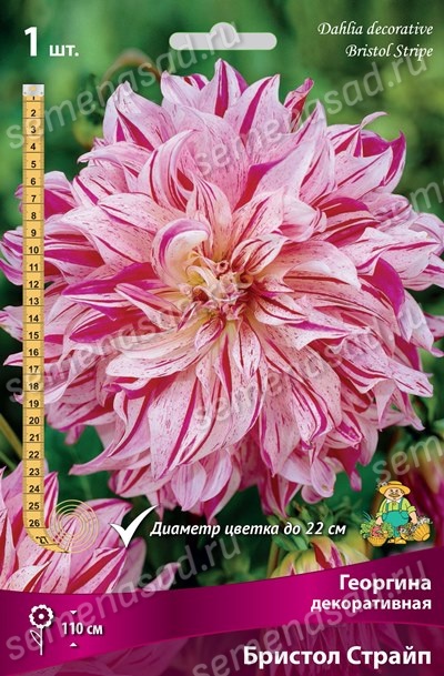 Георгина декоративная Бристол Страйп — яркий декоративный однолетник. Растение высотой до 110 см. Цветок очень крупный, диаметром до 22 см. Полосатой окраски, розово-белый, с малиновыми штрихами и напылением. Лепестки волнистые, продолговатые, слегка закрученные, имеют неоднородную окраску. Цветение длительное, можно наблюдать с июля по октябрь. Дает хорошую срезку. Сорт характерен длительной стойкостью в срезке.
