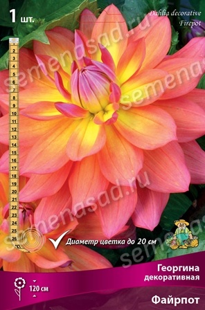 Георгина декоративная Файрпот — пышные цветоносы уникальной окраски, которые прекрасно дополняют любую ландшафтную композицию, становясь одним из наиболее выигрышных элементов оформления. Данный сорт является любимцем современных цветоводов. Куст имеет пышную форму и большое количество соцветий. Высота взрослого растения может достигать 100-120 см, диаметр цветка до 15-20 см. Лепестки окрашены в оттенки оранжевого и кирпично-красного, словно охвачены пламенем заходящего солнца, создавая необычайно теплую и уютную ауру. Серединка цветка ярко-желтая, будто маленький источник света, мягко подсвечивающий лепестки изнутри, отчего создается впечатление внутренней подсветки. Такое необычное сочетание цветов и легкая игра света делают этот цветок настоящим произведением искусства, достойным занять почетное место в коллекции каждого садовода. Георгина Файрпот отлично подходит для выращивания в саду в грунте, цветниках, идеальна для срезки.