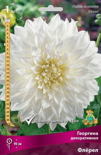 Георгина декоративная Флёрел — белоснежные цветы выглядят как пушистые крупные шарики, состоящие из множества лепестков. Их сияющий белый цвет завораживает и восхищает своей ослепительной красотой! Сердцевина бутона легкого сливочно-желтого оттенка. Лепестки слегка закручены на краях. Высота растения около 90 см. Цветок очень крупный, диаметром до 25 см. Период цветения: июль – сентябрь. На одном цветоносе может образовываться около 5-7 бутонов. Использование в ландшафте: альпинарий, цветник, групповые посадки в открытом грунте. Отлично подходит на срезку.