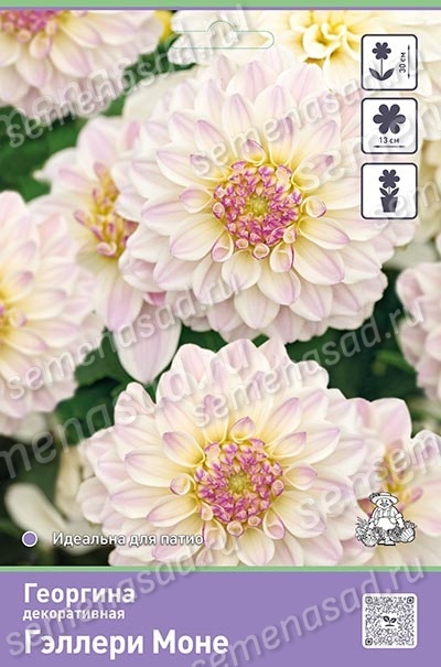 Георгина декоративная Гэллери Моне — красивоцветущее растение с компактным кустом, высотой до 30 см. Прекрасно подходит для оформления переднего плана цветника, бордюрных линий, а также выращивания в горшках. Цветы диаметром около 13 см, нежной пастельной окраски. Оттенки лепестков представляют собой сочетание цвета слоновой кости в центре с розово-сиреневым по краям, сердцевина цветка подсвечена лёгким кремово-желтым тоном. Цветение пышное и продолжительное. На одном кусте за сезон может образовываться до 25-ти бутонов. Благодаря привлекательному внешнему виду и неприхотливости в уходе, георгина Гэллери Моне станет идеальным решением для тех, кто хочет создать красочные и эффектные композиции в своем саду.