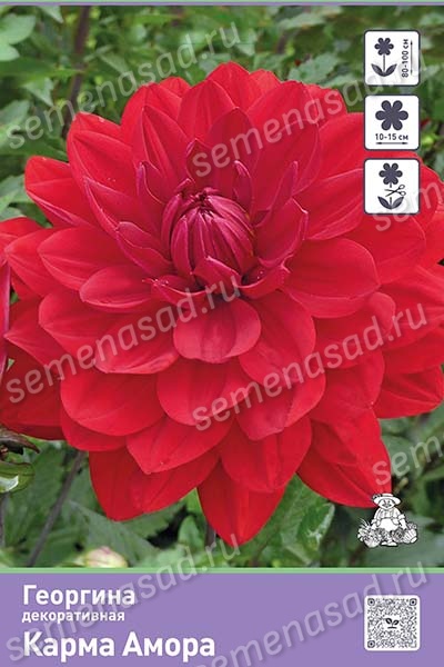 Георгина Карма Амора – высота 80-100 см, диаметр 10-15 см. Эта георгина настоящее украшение, цветущее темно-красными цветами. Длительное цветение и большое количество цветков будут радовать вас все лето. Прекрасно смотрится на клумбах, бордюрах и рабатках.
