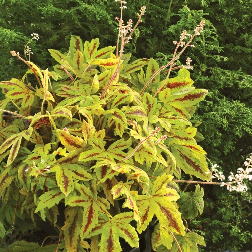 Гейхерелла Санрайс Фолс.  Вид, полученный от межродового скрещивания гейхеры с тиареллой сердцелистной. Гейхерелла формой листьев и более мелким габитусом ближе к тиарелле. Однако розовые тона цветков гейхереллы напоминают скорее гейхеру. Осенью листья гейхереллы ярко окрашиваются. Гейхерелла, так же как и гейхера, образует плотный кустик.