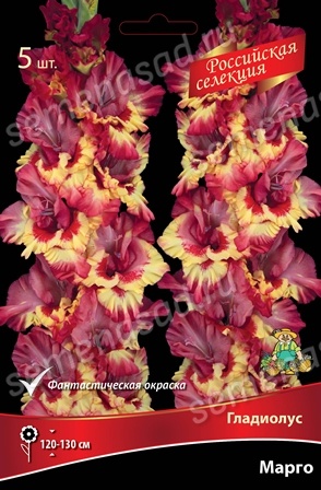 Марго - высота растения 120-130 см. Фантастическая контрастная окраска: насыщено-малиновый тон в сочетании с желтым. На трех нижних лепестках малиново-бордовое перистое пятно. Цветки хорошо гофрированные, с защипами в горле. Соцветие высотой до 70 см, идеально двухрядное, состоит из 23 бутонов, одновременно открыто 9.