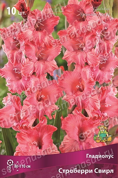 Гладиолус Строберри Свирл – ярко-красные цветы с игривыми белыми полосками. В диаметре бутоны достигают 12-14 см. Прочные стебли вырастают до 80-110 см в высоту,иногда могут достигать 130 см. Период цветения: июль-сентябрь. Сорт прекрасно смотрится в цветниках в открытом грунте, а также в букете. Крупные, яркие, ароматные цветы привлекают внимание своим изысканным внешним видом. Название сорта гладиолуса на английском звучит как «Клубничный вихрь», и именно так эти цветы заполнят ваш сад ярким водоворотом веселья и радости!