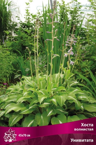 Хоста волнистая Унивитата — эффектное многолетнее растение, которое ценится как за декоративную листву, и способное оживить любой уголок сада. Куст средних размеров достигает высоты 40–50 см и разрастается в ширину до 70–90 см, демонстрируя при этом очень быстрый темп роста. Крупные листья продолговато-яйцевидной формы (размером примерно 20х13 см) с характерным завитком на кончике являются главным украшением сорта. Тёмно-зелёная глянцевая поверхность листа расписана кремово-белыми мазками, сосредоточенными в центре. Интересная особенность проявляется после цветения, когда молодая листва в центральной белой зоне приобретает тонкую зелёную штриховку, добавляя облику живописной изменчивости. В середине лета растение выпускает длинные, до 80 см, цветоносы, которые увенчаны соцветиями нежных колокольчиковидных цветков сиренево-фиолетового тона. Благодаря своей фактурной листве и быстрому разрастанию, Унивитата великолепно смотрится как в солитерных посадках, создавая яркое пятно, так и в композициях с другими многолетниками, где служит идеальным фоном или контрастным акцентом.