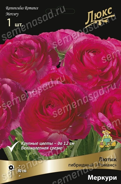 Меркури - высота растения 80 см. Необычайно красивый, величественный лютик. Быстро набирает популярность, благодаря крупным махровым цветкам и резной декоративной листве. Цветы грациозные, ярко-розовой окраски с красивым сложением лепестков. Серединка розово-пурпурная. Диаметр цветка 10-12 см. Великолепно смотрится в букетах.
