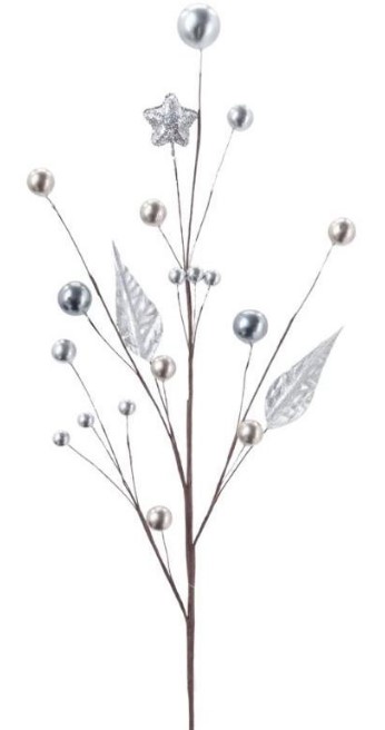 Ветка декоративная с бусинами, листьями и звездами, h45см, серебряный