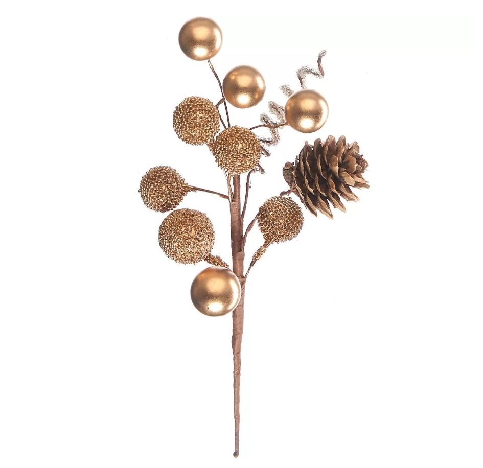 Ветка искусственная с шариками и шишкой h15,5см золотой
