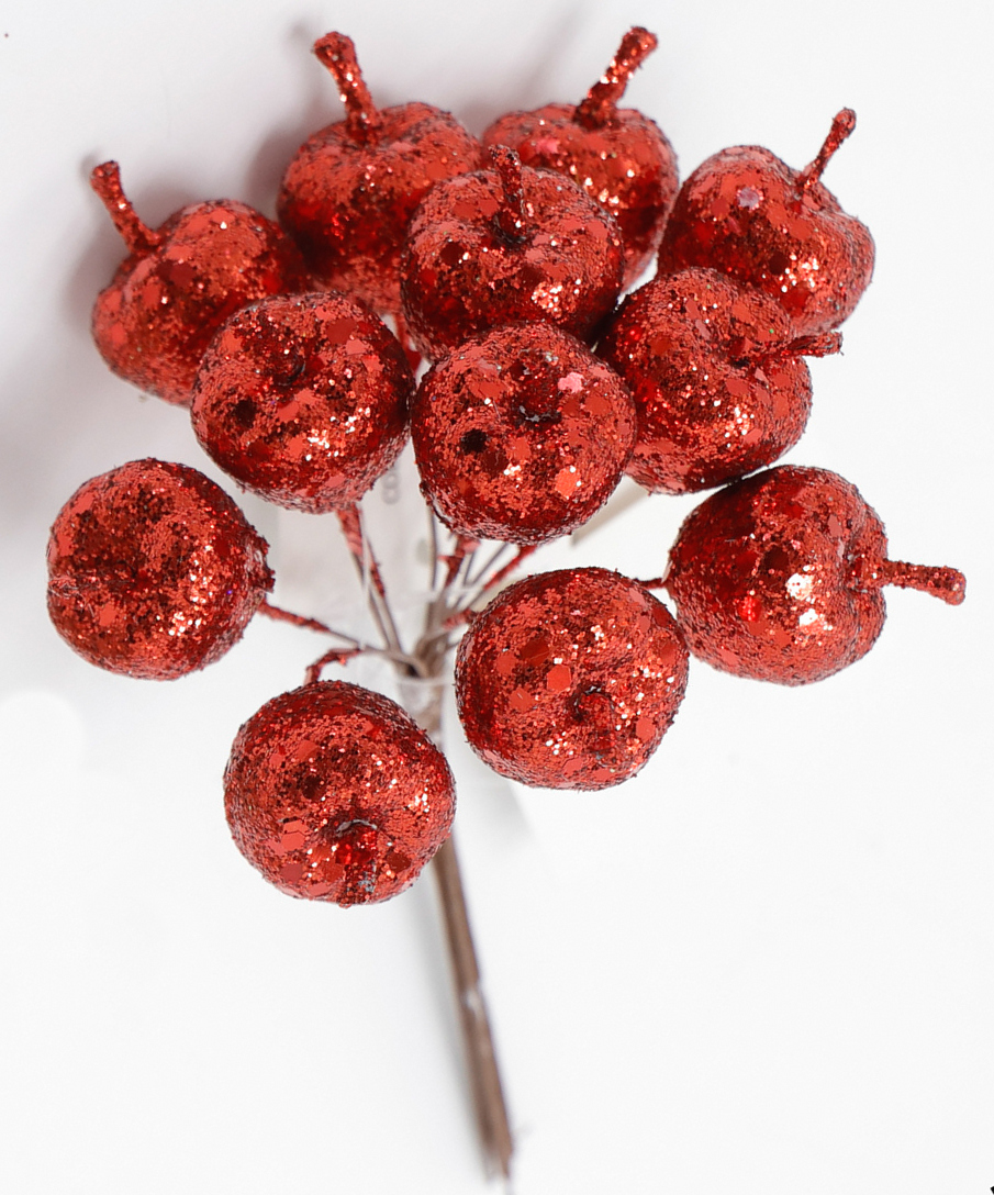 Яблоки на проволоке в связке с глиттером, h16см,12шт, красный