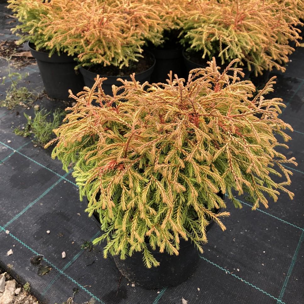 Карликовый, медленнорастущий хвойный кустарник с подушковидной формой кроны. Отличается яркой золотисто-оранжевой хвоей, которая зимой приобретает бронзовый оттенок. Высота взрослого растения (10 лет) — около 30–40 см, диаметр — до 100 см. Сорт морозостойкий (зона 3-4), любит солнце и влажные почвы.