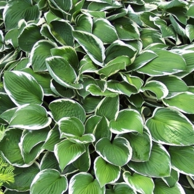Французскую хосту отличают темно-зеленые листья, украшенные узенькой контрастной белой каймой, оттенки перехода цветов выражены бело-зелеными полосами. Листовые пластины крупные, форма напоминает сердце. С внешней стороны поверхность листвы матовая, имеются прожилки, на обратной стороне есть сизый налет. Длина листьев варьируется от 20 до 25 см, при ширине 10-13 см.