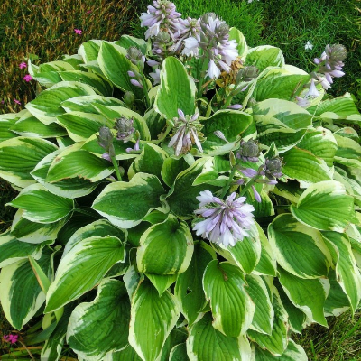 Хоста «Вайд Брим» (Wide Brim) — средняя (размер М), высота 45 см, ширина куста 75 см. Сердцевидные сине-зеленые листья с широкой желтой каймой, к лету — светло-кремовой. Лист плотный, жатый. Куст красивой сферической формы. Место посадки: полутень, или солнечное с полуденным притенением. Цветет обильно, во время цветения становится еще красивее.