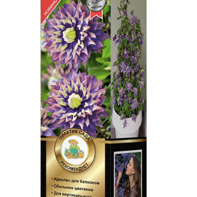 Цветки средней величины, всегда махровые, имеют три стадии раскрытия бутонов и меняют форму по мере цветения, очень декоративные, фиолетово-голубые с зелёно-жёлтыми кончиками лепестков. Цветёт всё лето на побегах текущего года. В июне цветение наиболее обильное. За опоры цепляется листовыми черенками. Высота до 2м