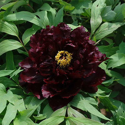 Японский сорт, относится к виду так называемых "черных пионов". Очень крупный цветок (25 см) открытой формы, с необычным темным черно-красным цветом. Желтые тычинки на фоне практически черных бархатных лепестков создают незабываемо-приятное зрелище. Обладает не сильным, но приятным и нежным ароматом. Цветение обычно начинается в мае и проходит в течение двух недель. Но может начаться и в июне. Характеризуется очень большим количеством изумительных крупных цветов необычного, почти черного, окраса. Высота куста 200-210 см.