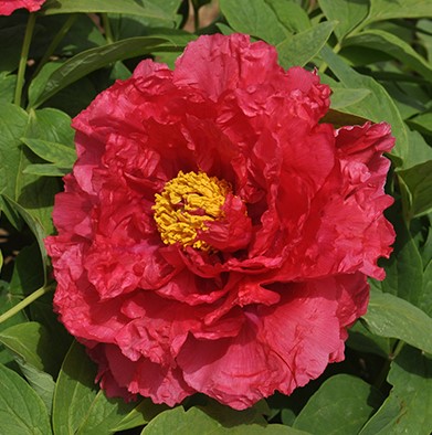 Пион древовидный Нью сан мун (Paeonia Suffruticosa Xin ri yue) Цветок полумахровый – махровый, диаметром до 18 см, тёмно-алый. В центре золотистые тычинки. Срок цветения средний. Цветки смотрят вверх или в стороны. Стебли прочные. Куст компактный, высотой 120-150 см. Местоположение: солнце. Почва: нетребователен к почвенным условиям, но лучше растет на плодородной, щелочной, хорошо дренированной почве. Устойчивость к условиям среды и болезням: устойчив к болезням и вредителям. Использование: одиночные и групповые посадки.