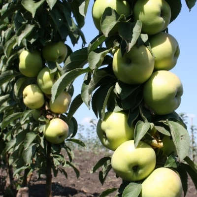 Колоновидная. Летний сорт, устойчив к холодам. Высота 2-2.2 м, мощная развитая корневая система, лист светло-изумрудный. Плод светло-зеленый, с желтым отливом и красным румянцем на боку, 150 гр, вкус кисло-сладкий, сочный, присутствует приятный аромат, десертный. На одном дереве созревает очень много плодов, плодоношение на 4-5 год после посадки. Товарность и транспортировка высокая, лежкость 50-60 дней.