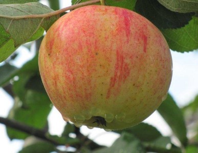 Плоды среднего иди вышесреднего размера (140 г), одномерные, иногда приплюснутые, округлые, с широкими слабозаметными ребрами, скошенные. Кожица гладкая, сухая, блестящая. Основная окраска плодов зеленовато-желтая во время съема и светло-желтая в период потребления плодов. Покровная окраска занимает большую часть плода – в виде красных полос по карминовому фону.