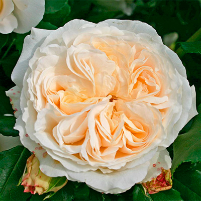 Роза с густомахровыми ностальгическими чашевидными кремово-белыми цветками с легким ароматом. Очень устойчива к черной пятнистости. Куст высота 80 см и шириной 50 см.
