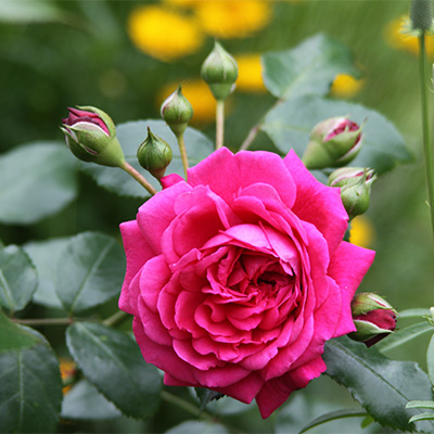 Цветки ярко-розовые, густомахровые, в кистях по 6-8 шт. Листва темно-зеленая, густая, блестящая, средних размеров.