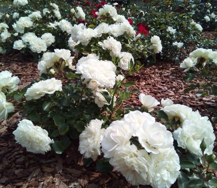 Цветы диаметром 7-10 см белые, густомахровые, розетковидные, соцветиями по 5-10 шт. Аромат цветка слабо выраженный. Большие глянцевые листья типичной формы обладают тёмно-зелёным цветом. Куст высотой 50-80 см стебли усыпаны большим количеством шипов. Этот куст роз отлично подходит для выращивания в контейнере либо на газоне. Растение может использоваться в качестве почвопокровного. Хорошая устойчивость к заморозкам и дождливой погоде, длительное повторяющееся цветение.
